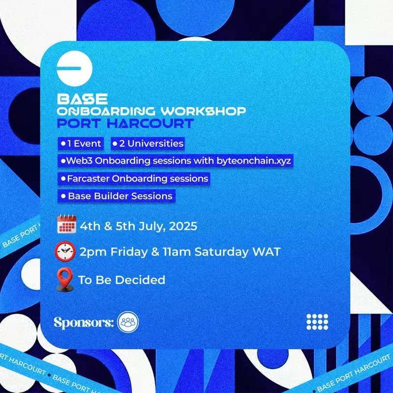 1 Event, 2 Universities. 🗓️ Date: 4th and 5th July, 2025 ⏰ Time: 2:00pm and 11:00am 📍Venue: Day 1: University of Port Harcourt | 2:00pm Day 2: Rivers State University | 10:00am Join us and learn everything you need to know to get started on Base, so come and get onboarded! Location Port Harcourt Rivers, Nigeria